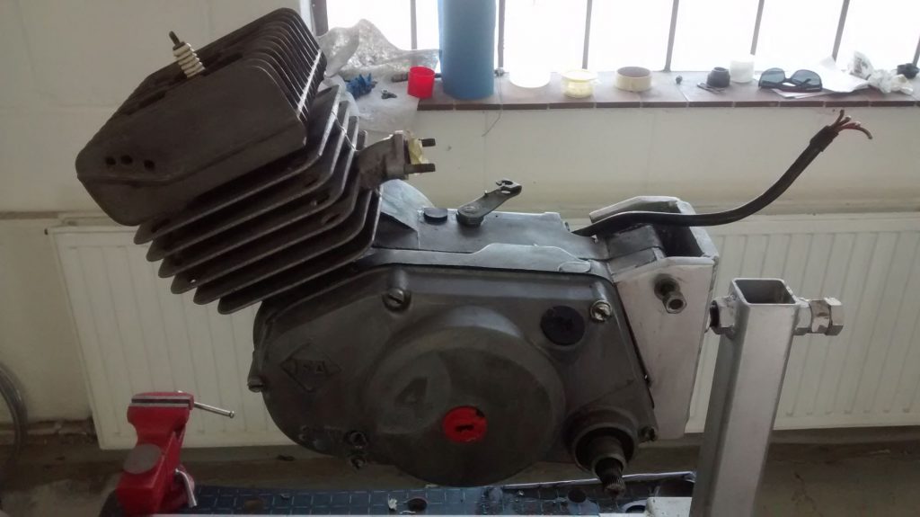 Der Motor vom Typ M541 liess sich wie schon erwähnt drehen, trotzdem wollte ich ihn so weit wie möglich zerlegen, ohne ihn zu spalten. Die Lager machten überraschenderweise noch einen recht guten Eindruck, deshalb schob ich den Bau einer Spaltvorrichtung für den Motor noch etwas nach hinten. Einen Motorständer hab‘ ich aber gebaut, er hat die Arbeit am Motor wirklich erleichtert. Zündung und Kupplungskorb wurden abgebaut und gereinigt, diverse Teile ausgetauscht und alles wieder montiert. Den Vergaser hab‘ ich zerlegt, gereinigt und mit neuen Düsen und Dichtungen bestückt. Nachdem ich die Zündung voreingestellt hatte, machte ich einen ersten Probelauf auf meiner mobilen Werkbank. Als provisorischer Tank diente eine Kunststoffflasche an einer Dachlatte.